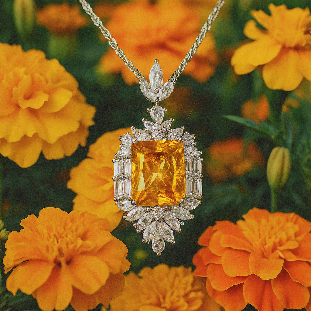 The Marigold Necklace features a stunning citrine‑hued gemstone, framed by a halo of sparkling marquise and baguette‑cut stones, evoking the layered petals of a marigold in full bloom.