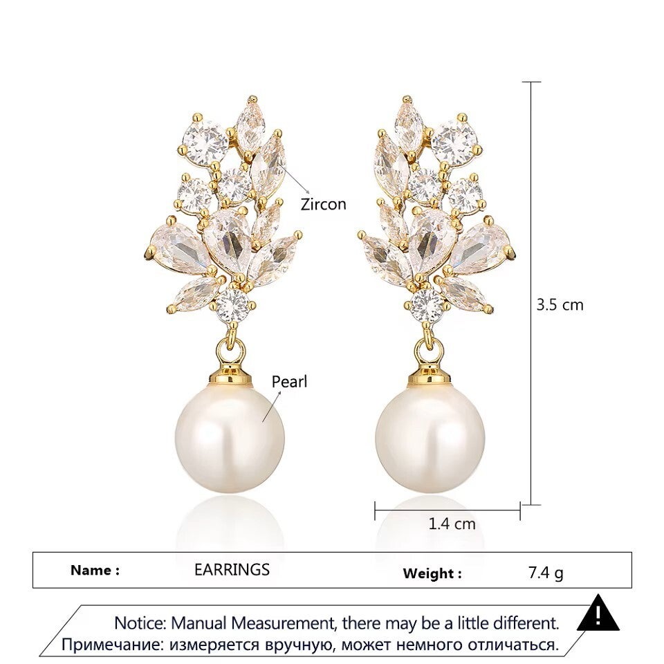 Add a touch of timeless charm to your ensemble with these exquisite drop earrings, crafted to blend classic elegance with modern sparkle. Each earring features a luminous round pearl suspended from a gold-tone setting adorned with intricately arranged zircon stones in a floral-inspired design.