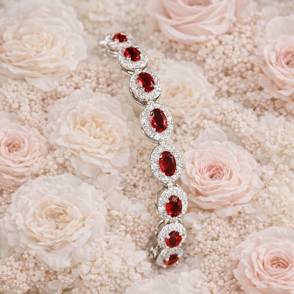 Set in high‑polish white gold / silver‑tone metal, this bracelet offers a refined, luminous finish that enhances the vivid ruby tones. The floral‑inspired arrangement — beautifully complemented by soft blush and cream rose petals — makes this piece perfect for bridal styling, evening glamour, and fine‑art jewellery photography.